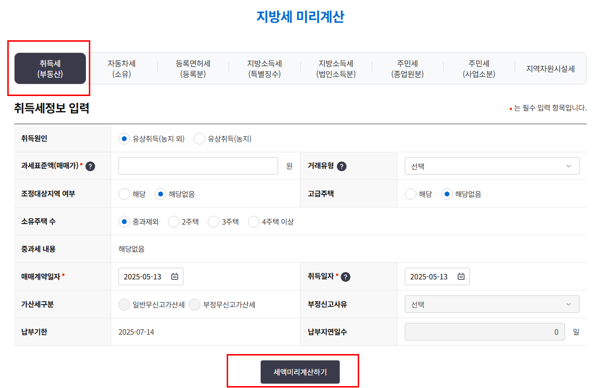 → ‘신고하기’ → ‘취득세 자동계산’
